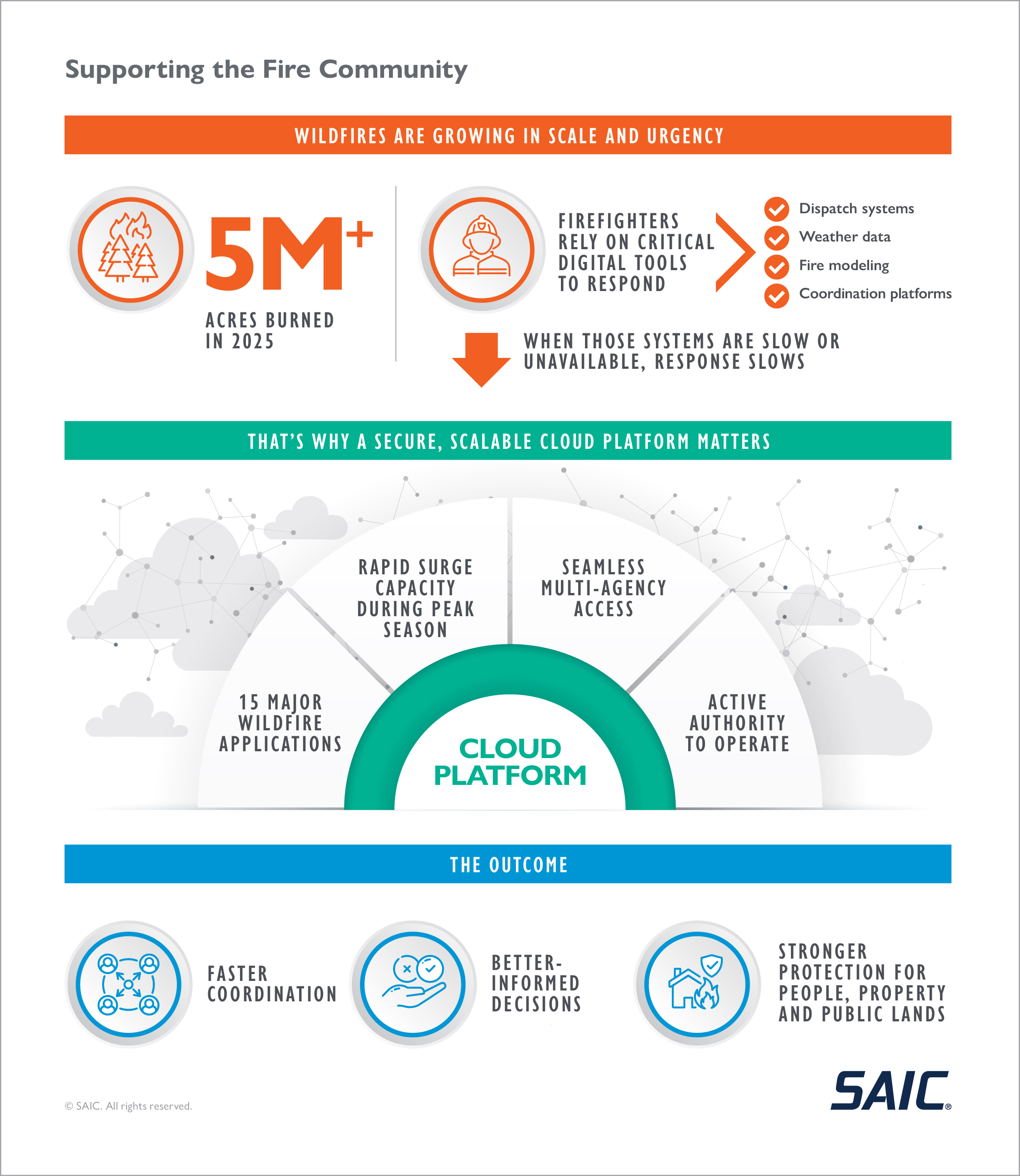 To meet this challenge, DOI partnered with SAIC to create a secure, scalable platform with an active Authority to Operate (ATO), ensuring mission-critical systems remain available to firefighters. The platform hosts and supports essential wildfire applications used across federal, state, local and tribal agencies. Designed for resiliency and supported by a dedicated SAIC team, it enables agencies to coordinate seamlessly, adapt quickly to shifting conditions and maintain operational continuity both in and out of active fire season.